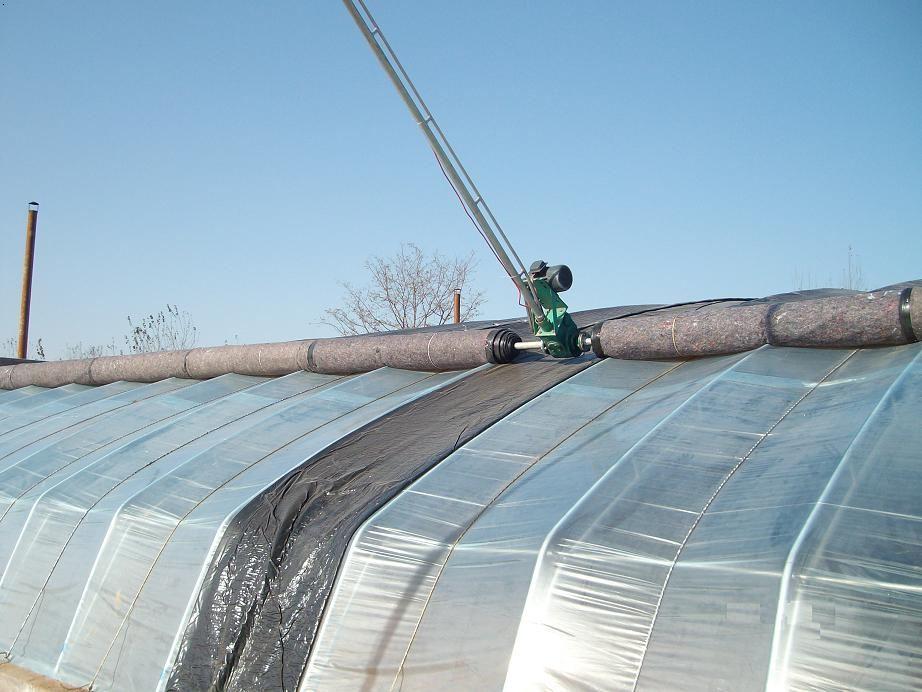 南墻內(nèi)保溫系統(tǒng)采用了傳統(tǒng)日光溫室側(cè)擺臂卷簾機(jī)的卷被系統(tǒng),卷簾機(jī)安裝在溫室一端靠近山墻的位置。由于南墻內(nèi)側(cè)沒有支撐構(gòu)件,為了使卷簾機(jī)在卷被過程中獲得支撐,壽光九合農(nóng)業(yè)內(nèi)保溫溫室設(shè)計(jì)了一組緊繃的繩索,一端固定在前墻屋檐處,另一端固定在溫室前墻立柱基礎(chǔ)。這種柔性的支撐面,一可以滿足卷被支撐的要求;二可以節(jié)省鋼材;三可以減少骨架遮光。柔性繩索造價(jià)低廉,更換方便,是一種經(jīng)濟(jì)有效的選擇。